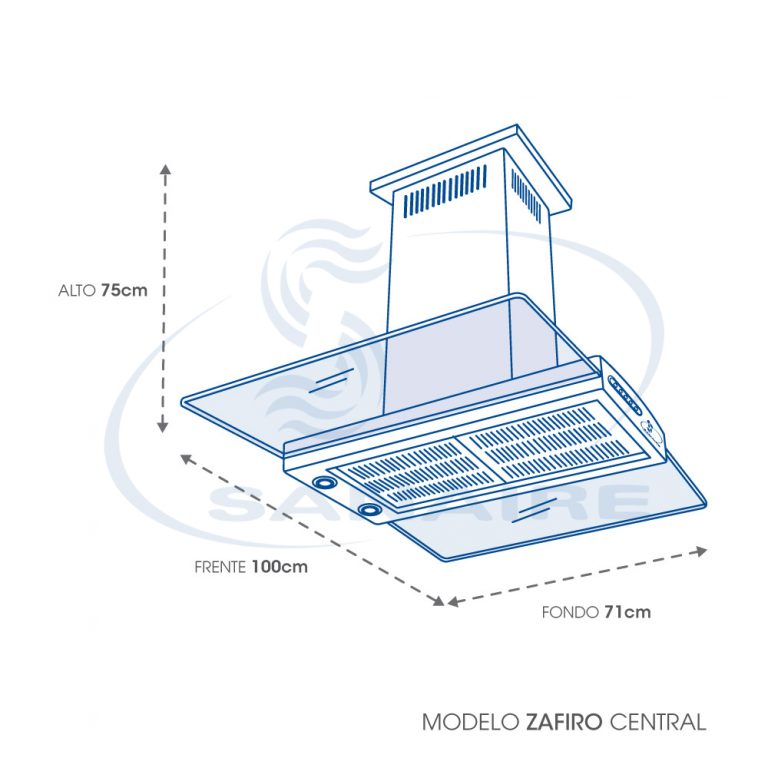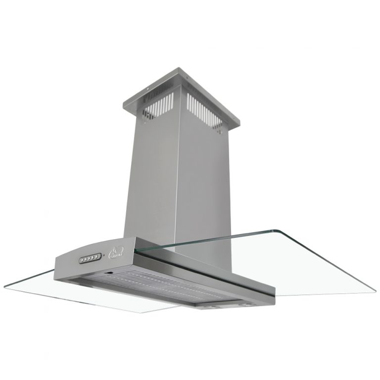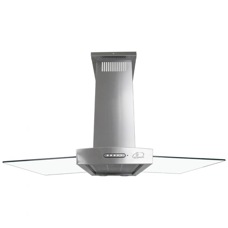 Campana de Cocina central o de isla, Acero Inoxidable, colores (esmalte) Almendra, Blanco, Gris metálico, Negro, Negro Mate, capacidad máxima 12m³ x minuto, 720m³ x hora, consumo 90W, tres velocidades, doble lámpara de led, botonera digital, control remoto, ahorro de energía.