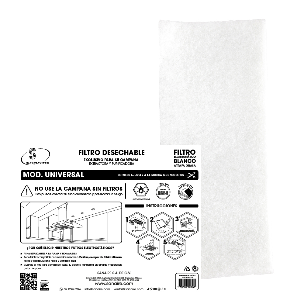 Puedes adquirir con nosotros filtros de repuesta con la medida exacta que necesita tu campana de cocina Sanaire, sin embargo también contamos con un filtro universal que se adapta a muchas campanas de cocina.