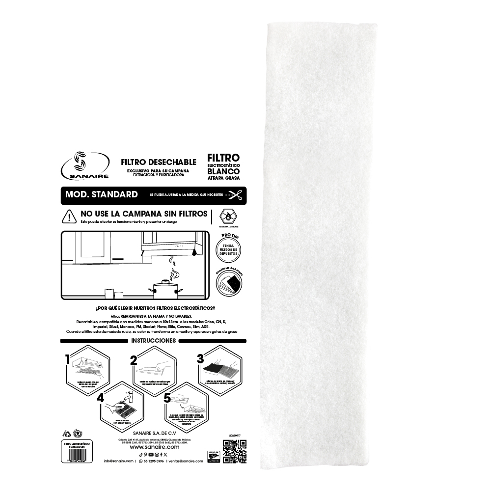 Puedes adquirir con nosotros filtros de repuesta con la medida exacta que necesita tu campana de cocina Sanaire, sin embargo también contamos con un filtro universal que se adapta a muchas campanas de cocina.