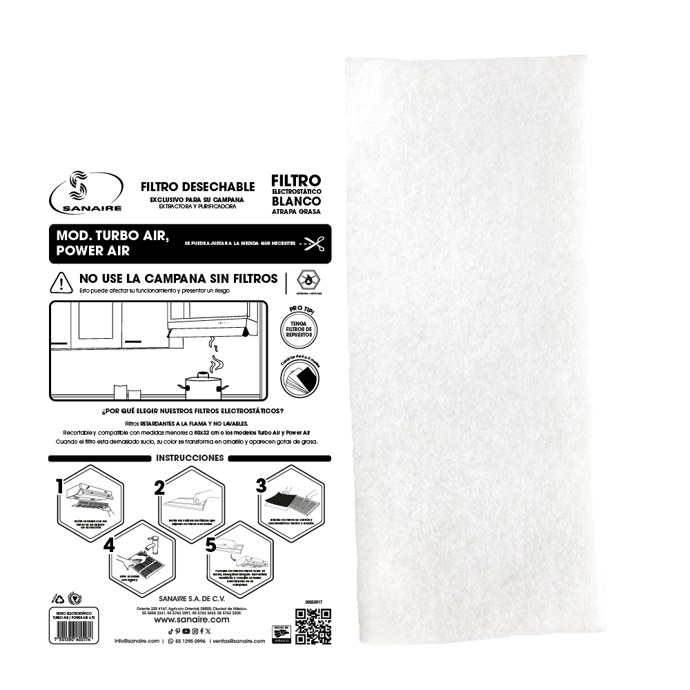 Puedes adquirir con nosotros filtros de repuesta con la medida exacta que necesita tu campana de cocina Sanaire, sin embargo también contamos con un filtro universal que se adapta a muchas campanas de cocina.